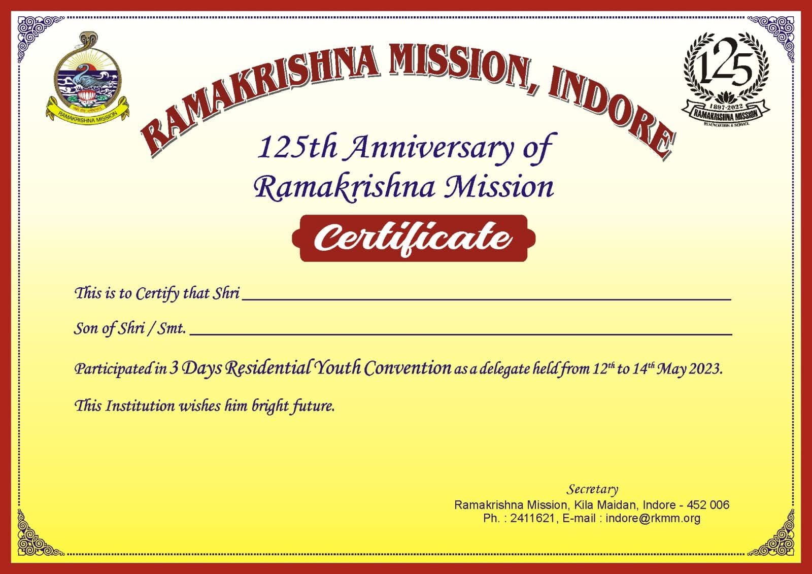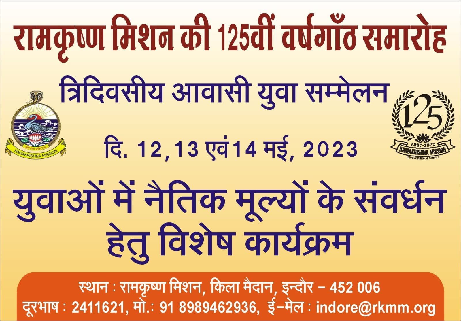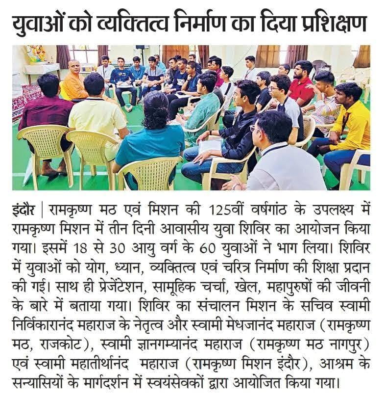 In connection with the 125th anniversary of Ramakrishna Mission, Indore Ashrama organized a three-days Residential Youth Convention in Ashrama premises from 12th to 14th May, 2023.