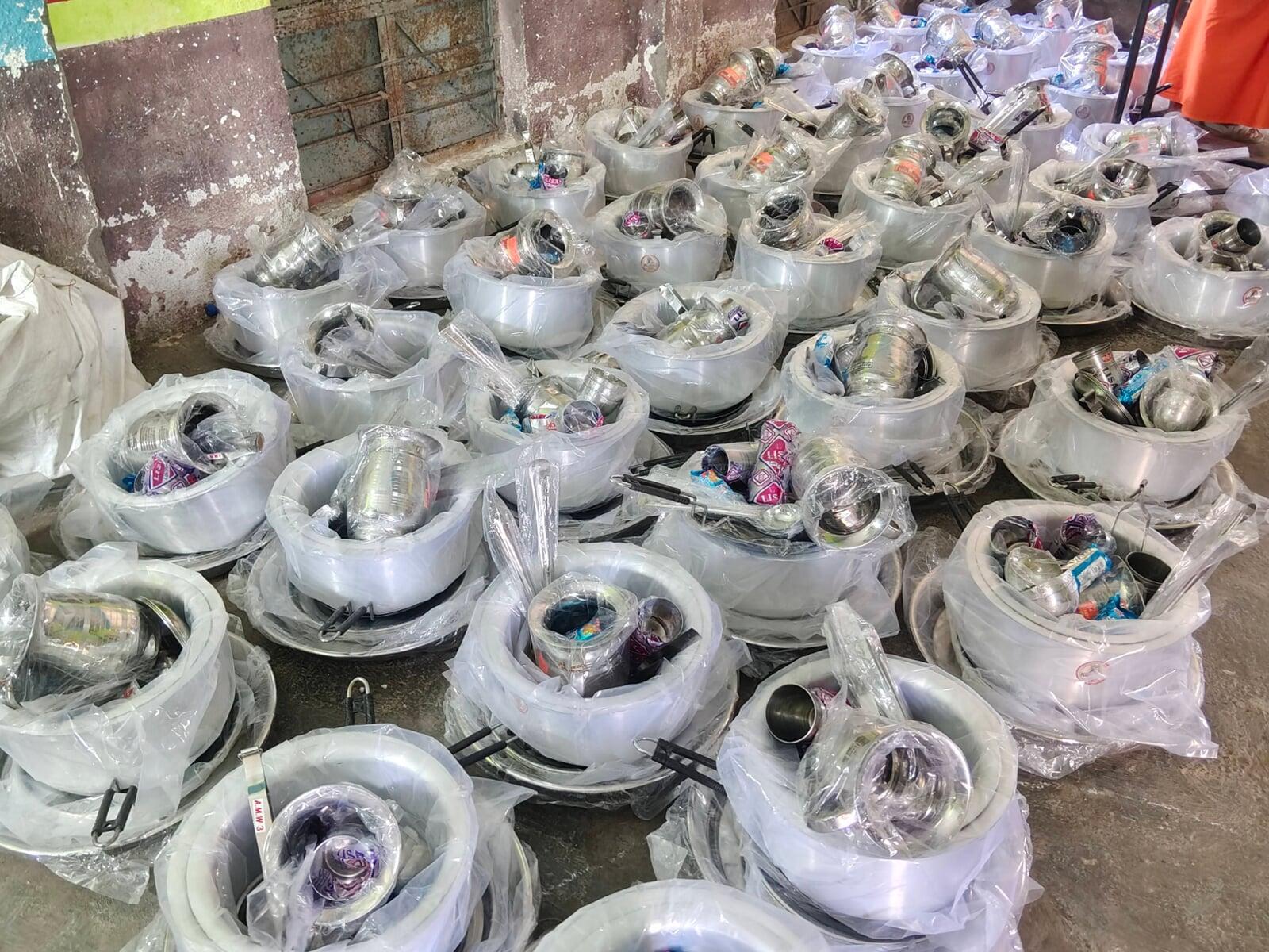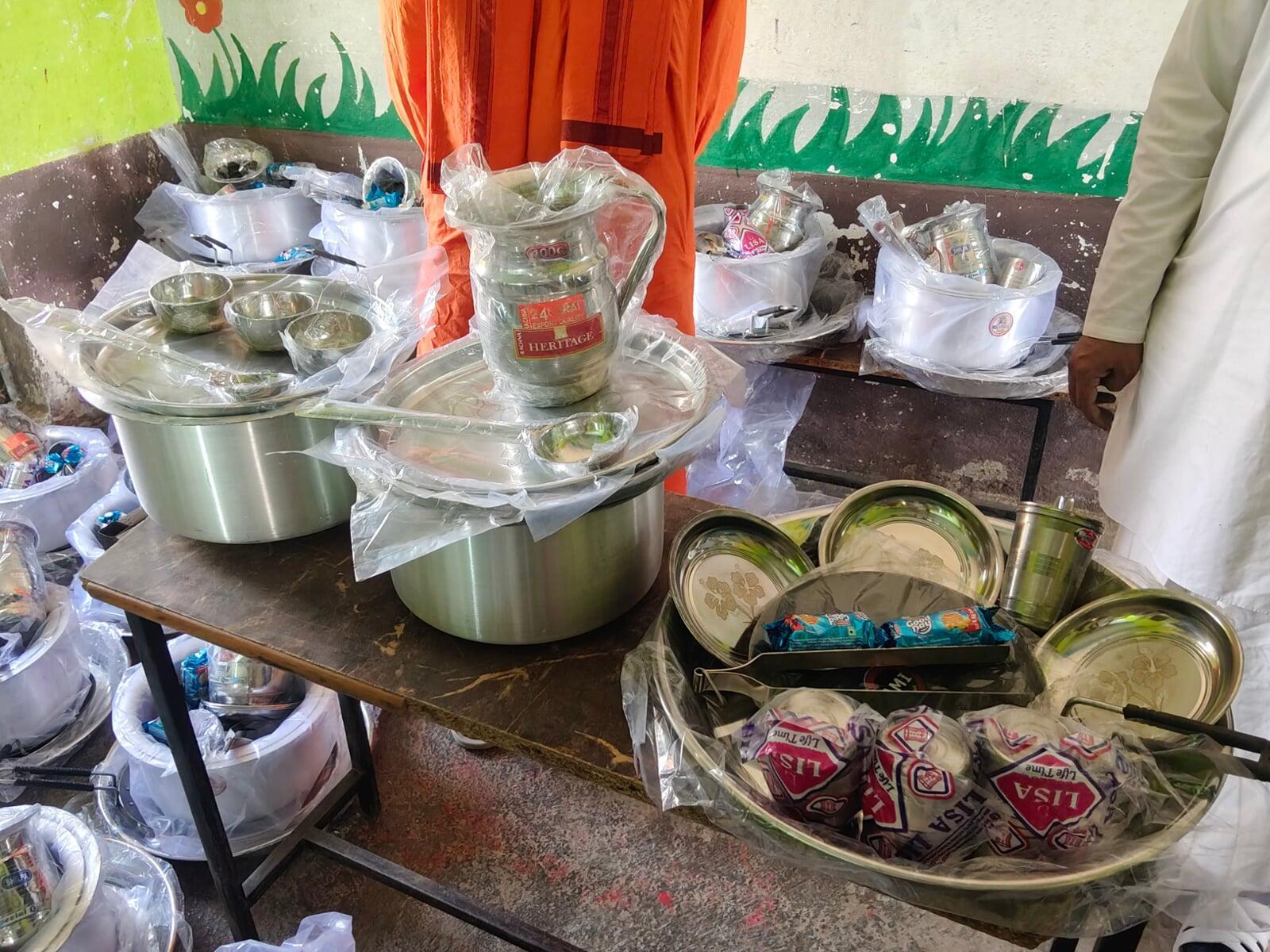 Each family received a comprehensive set of utensils designed to assist in their daily domestic needs. The distributed sets comprised the following items: two ladles, one parat (large plate), one jug, three plates, three bowls, three glasses, three spoons, two pans, one griddle (tawa), one pair of tongs.
